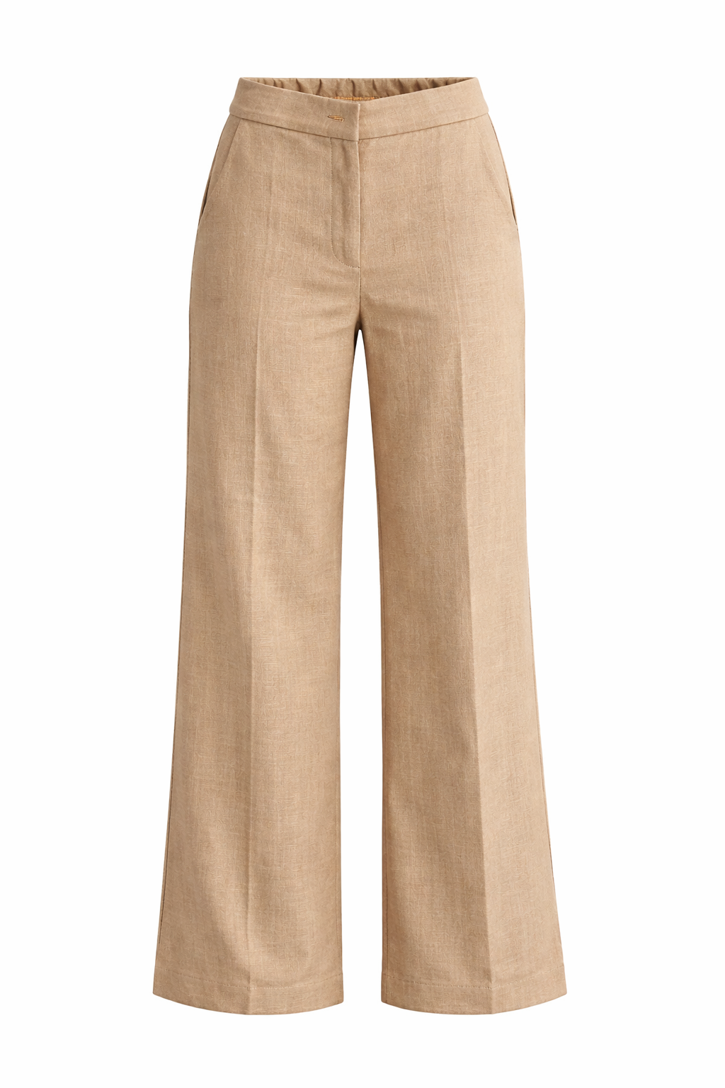 Elevate your wardrobe with this camel linen-look tailored two-piece set featuring a structured sleeveless blazer with tie waist and coordinating high-rise wide leg trousers.