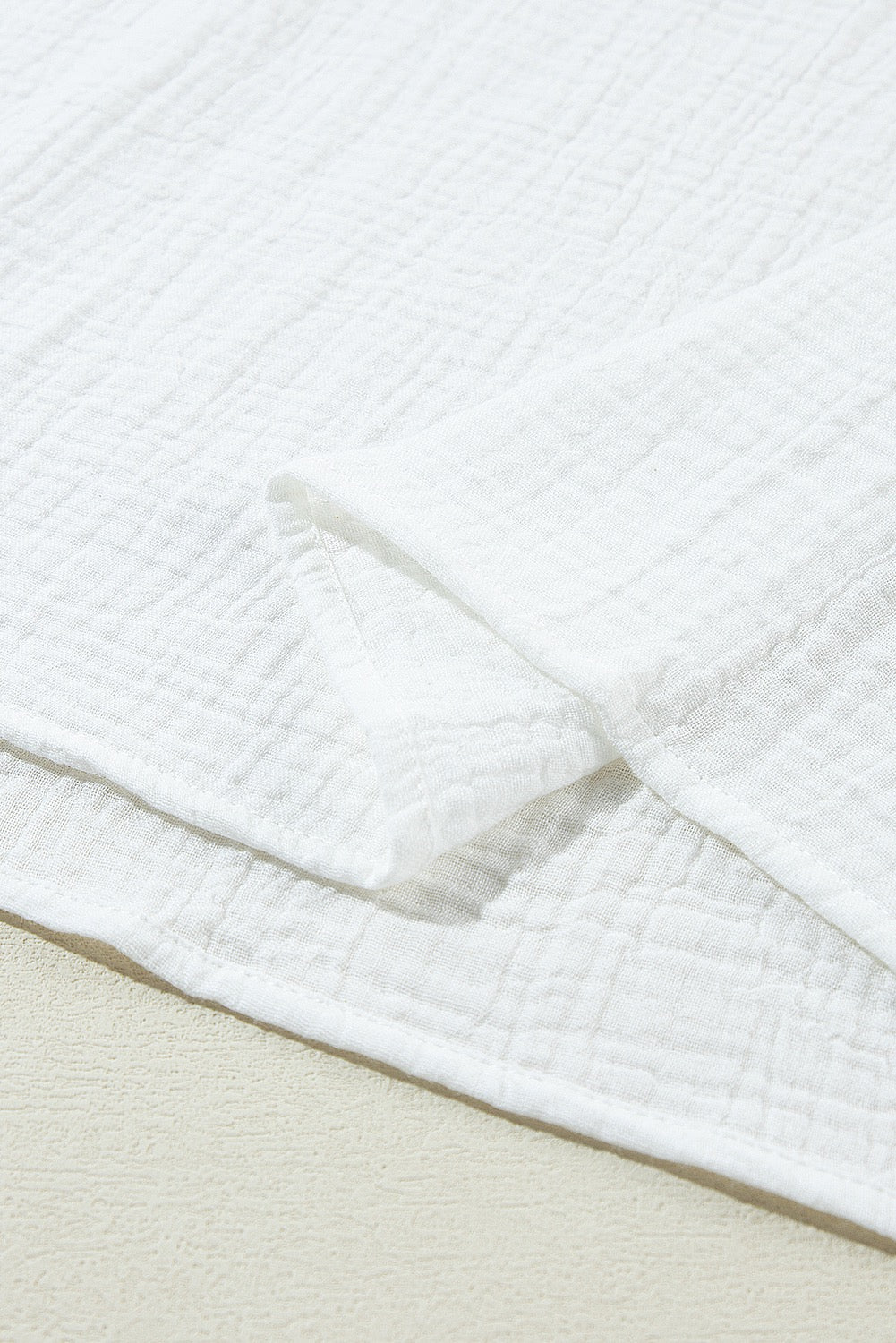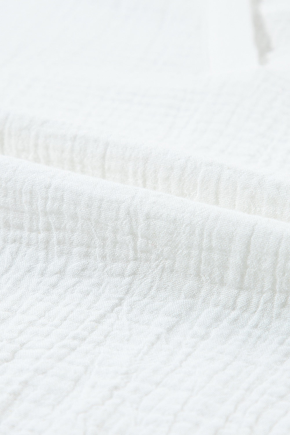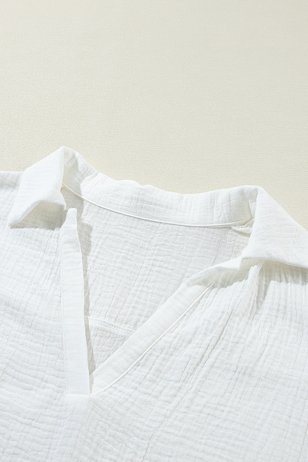 This versatile white blouse offers easy pairing with its crinkle textured fabric and V-neck design. The short sleeves provide comfort and style, making it a perfect addition to any wardrobe. The crinkled lace adds a touch of sophistication, making this blouse a must-have for any fashion-forward individual.