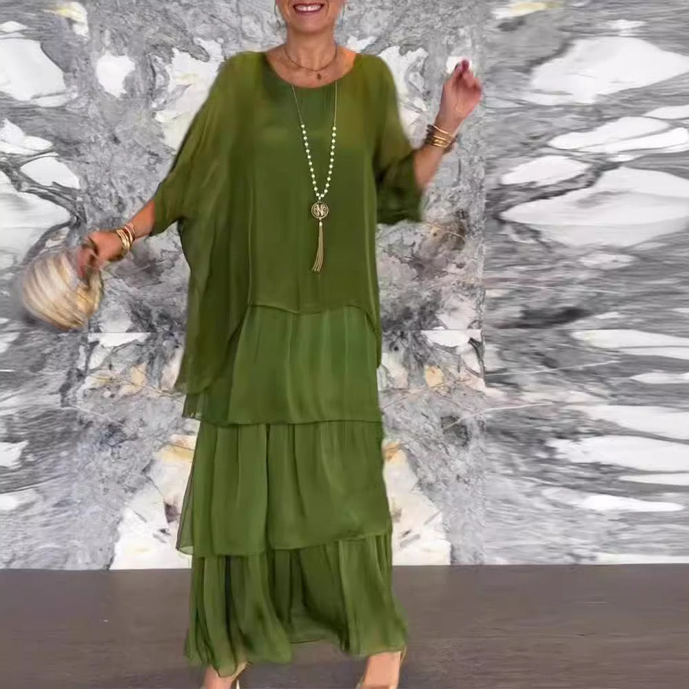 Step into effortless elegance with our Layered Chiffon Maxi Set in Olive Green, designed for sophisticated women who love comfort without sacrificing style. This flowy two-piece ensemble features a breezy, oversized chiffon top paired with a tiered maxi skirt that drapes beautifully on every body type.