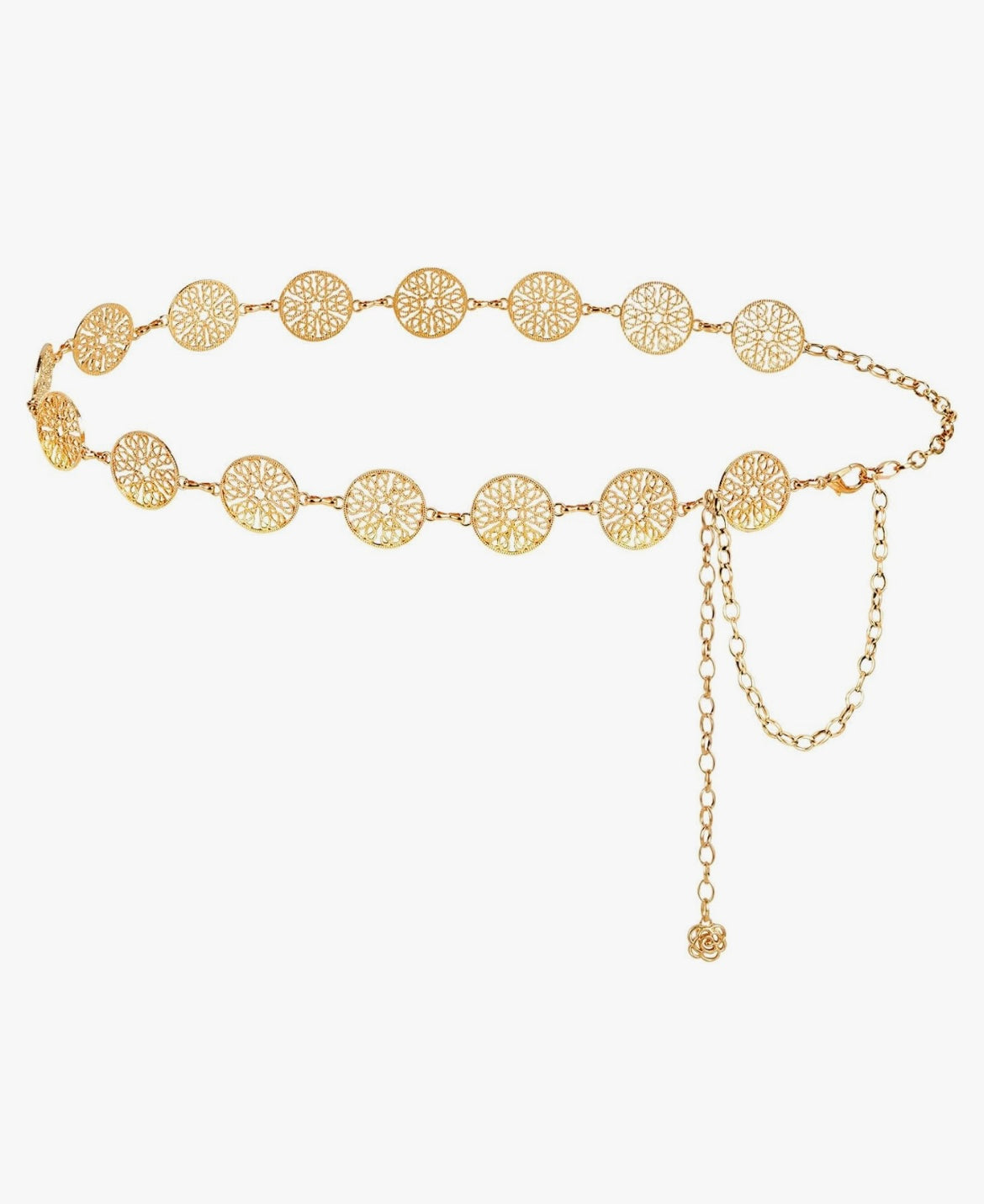 Add a touch of elegance and glamour to any outfit with our Filagree Medallion Waist Chain Belt in Gold. The intricate filagree design adds a unique and stylish element to your waistline, while the gold color brings a hint of luxury. Perfect for day or evening wear. Lobster claw clip.