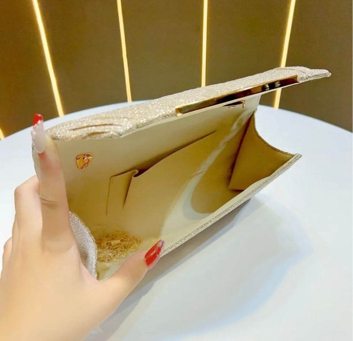 Gold Sparkle Evening Clutch – Elegant Rhinestone Pleated Handbag for Parties & Special Occasions