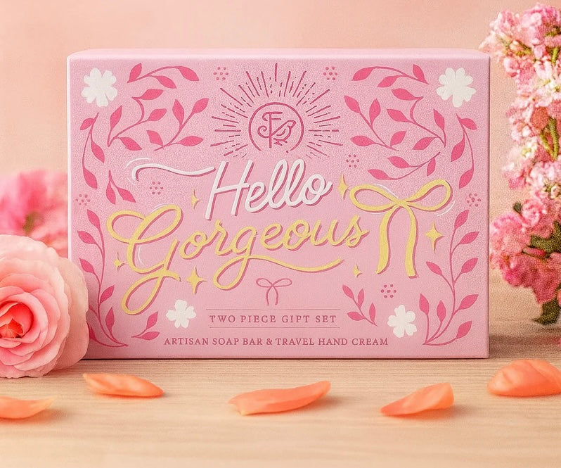 Introducing the Hello Gorgeous 2-Piece Gift Set, a perfectly curated duo designed to pamper and delight. Featuring a Pretty in Pink Soap Bar and Travel Hand Cream, this set surrounds you in the romantic, floral blend of Pink Peony and Jasmine. The creamy lather and silky hand cream leave skin soft, smooth, and beautifully scented. Elegant and feminine, each product is handcrafted with vegan, high-quality ingredients for a touch of everyday luxury. Wrapped in charming FinchBerry style, it’s the perfect gift to brighten someone’s day—or treat yourself.