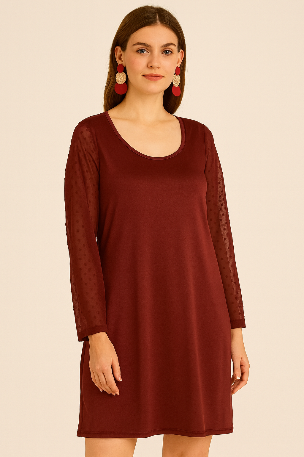 Round Neck Sheer Long Sleeve Swiss Dot Dress -Burgandy